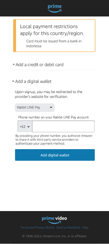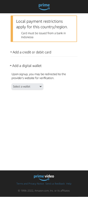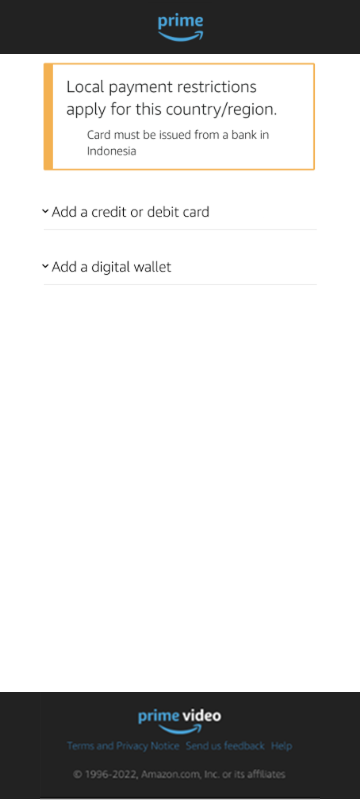 In this prototype, a first time Indonesian user signs up for Prime Video. They have no payment method on file, and no address on file.